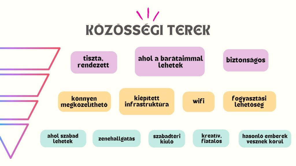 „A közösségi terek vonzerejét tekintve a kitöltők körében a legfontosabb szempontoknak a tisztaság, rendezettség, a barátokkal való találkozás lehetősége, valamint a biztonság számítanak. E jellemzők magasan vezetnek a többi elváráshoz képest, mely a fiatalok legfőbb szükségleteit összegzik. A fenti három szempont mellett kiemelt jelentőséget tulajdonítanak a válaszadó fiatalok az ideális közösségi terek kapcsán a könnyen megközelíthető lokációnak, a megfelelő infrastruktúrának, a wifi-elérés biztosításának, valamint az étel- és italfogyasztási lehetőségnek. A szabadság, kötetlenség a kérdőívet kitöltő fiatalok negyedének fontos szempont közösségi tér választásakor. A fiatalos, kreatív környezet 15 százalékuknál meghatározó elvárás, ugyanakkor alacsony jelentőséget tulajdonítanak annak, hogy a kialakításában részt tudjanak venni.”