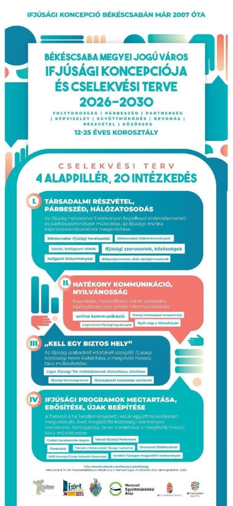 Békéscsaba Megyei Jogú Város Önkormányzat Közgyűlése 2025. december 11-én tartott nyilvános ülésén megtárgyalta és elfogadta Békéscsaba Megyei Jogú Város Ifjúsági Koncepciója és Cselekvési Terve (2026-2030) dokumentumot, ami a következő 5 évben lesz a fiatalok, felnőtt segítők és a döntéshozók számára a békéscsabai ifjúsági párbeszédrendszer sorvezetője. „A 2023-2025 között zajló feltáró munka része volt számos, Békéscsaba MJV Önkormányzata és a Liget Ifjúsági Tér által szervezett esemény, az ifjúsági referens által koordinált kérdőíves kutatás lebonyolítása, amelynek keretében folyamatos volt az együtt gondolkodás a szakmai irányítók és a fiatalok, fiatalokkal foglalkozó szervezetek, intézmények, egyesületek képviselői között.”